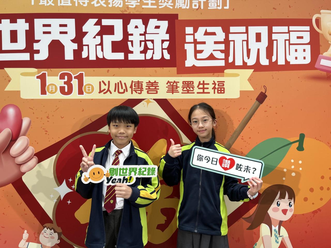 2026-01-31 恭喜5C黃伊霆及6A梁駿謙同學獲選成為星島新聞集團《我要讚佢》「最值得表揚學生獎勵計劃」(25 / 26年度)最值得表揚學生得主。他們除了得到社會的肯定外,亦被邀請於31/1/2026(星期六)參加由星島新聞集團舉辦的旗艦活動,主題為「以心傳善 筆墨生福 共創世界紀錄」,與教育局局長蔡若蓮女士、民政及青年事務局局長麥美娟女士及文化體育及旅遊局局長羅淑佩女士一同書寫「福」字,創世界記錄之餘,亦將「福氣」傳送開去。 梨主照相簿