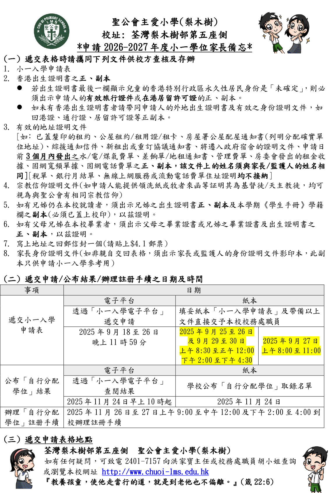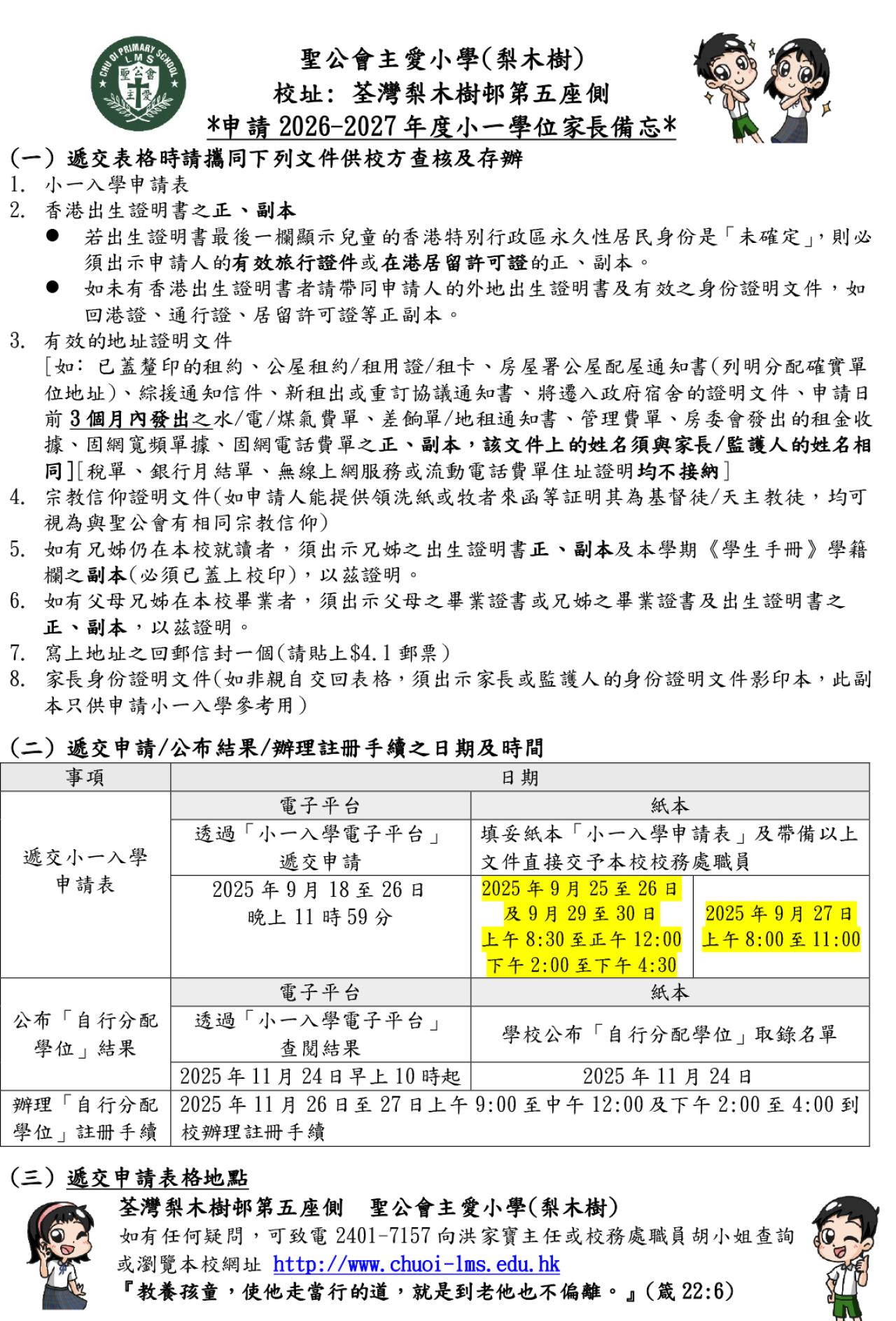 停課期間,學校暫停接收二○二六年度小一入學自行分配學位的紙本申請。有關紙本申請的截止日期延至九月三十日(星期二)。家長亦可選擇於九月二十六日(星期五)或之前透過「小一入學電子平台」(https://epoa.edb.gov.hk/)遞交電子申請,詳情載於教育局網頁。