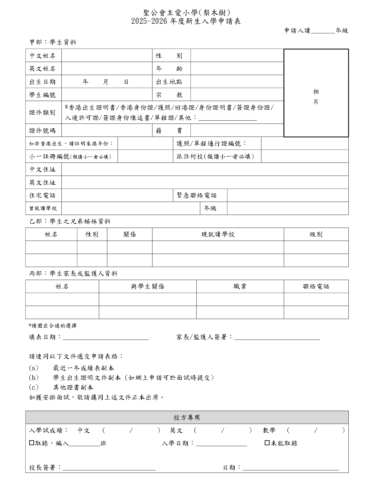 如家長欲為子女申請2025-2026學年於本校就讀的學位,請下載及填寫以下表格,並連同所列文件,遞交至本校一樓校務處。呈交資料如下:1. 填妥及貼上學生相片之申請表2. 身份證明文件(家長及學生)3. 最近期之學校成績表4. 課外活動表現紀錄或比賽獎項或學生個人概覽(如有)學校將會安排專人通知筆試或面試日期。