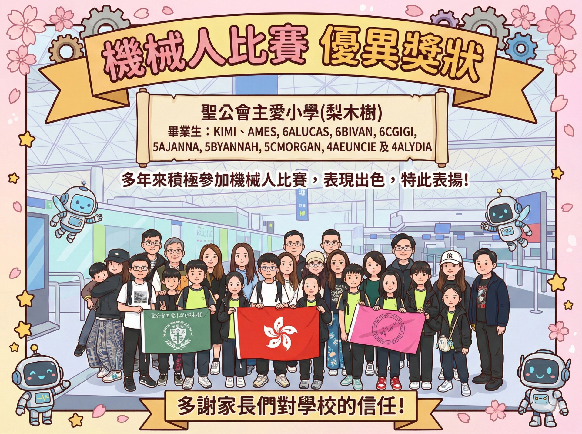 十位梨主機械人校隊隊員於2025年11月27日出發到越南參加2025 APRA 越南胡志明市國際錦標賽,競逐接力任務賽、遙控相撲賽及遙控足球賽多個項目。透過參與國際賽事,隊員不僅能近距離觀摩其他地區隊伍的機械設計及編程技術,還能開闊視野,體會世界之廣闊。在出發前,他們經歷了多次培訓,並對機械人進行反覆測試、改良、分拆及重組,力求盡善盡美。